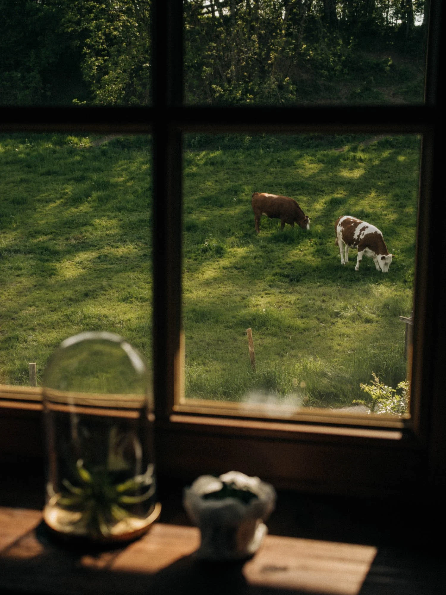 Gnarled beams from an old barn form the heart of the main building. From there, each lodging option holds a blending of the contemporary with an abundance of tradition. Cozy beds, high walls, bathtubs, hand-selected farm furniture, heaps of fluffy towels, cuddly daybeds, abundant light—and a spacious balcony for watching the sunset.