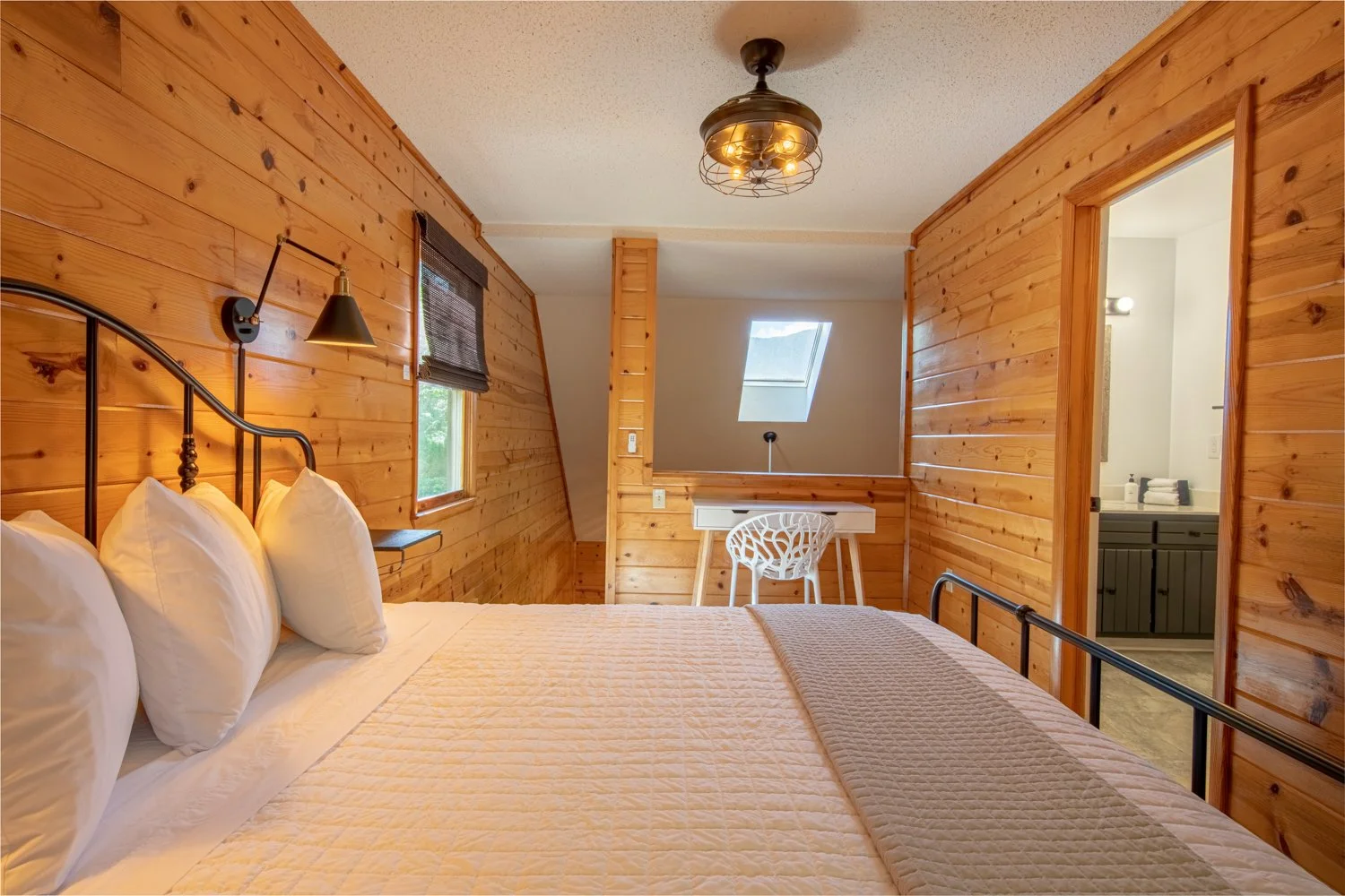 A great option for those open to sharing a space with friends! King, queen bed or twin bunk bed (first come first served basis) with high-end linens and mattress, shared en-suite bathroom, toiletries, shared refrigerator, indoor sitting area and porch with rocking chairs. Sign up with a group or let me know if you’re open to being paired with new friends!